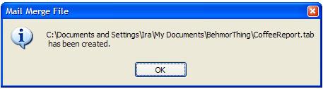 This feature allows you to print reports of a single coffee. Because I didn't want to force you to like my report, I made it a Word mail merge document so you can make it look like anything you wish. When you choose File=>Export to Word this will appear and it will tell you where the file is located. The file will always be called CoffeeReport.tab or RoastReport.tab.