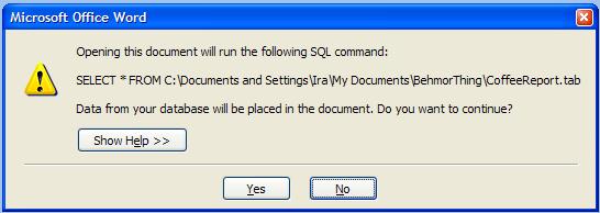 Once you've done that you need to open a Word mail merge file that can read that file. These two files are very basic examples of what to do. Download CoffeeReport.docx here: Download CoffeeReport.docx. Download RoastReport.docx here: Download RoastReport.docx. You should probably put the Word documents in your RoasterThing database folder, usually My Documents/RoasterThing or Documents/RoasterThing. Or if you've been using the program for a while, possibly My Documents/BehmorThing or Documents/BehmorThing. When I open either of those files I get this warning and I always say yes.