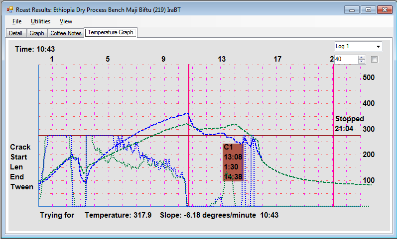 If you keep track of temperature during the roast, that line will appear along with temperature grid lines and degree labels. That information will also appear on the Temperature graph page where you can use the cursor to examine the graph and see the temperature at time at any point in the roast. RoasterThing now allows recording multiple temperatures during a roast. Here you see a roast with 2 temperatures recorded. I recently discovered that if you click on the choose log box, you can then use the mouse to move the cursor and the scroll wheel to change the log number.