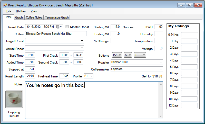 The details of the completed roasts can be viewed on the roast results page which will have between two and four tabs. It always has the Detail and Graph pages, if there are notes associated with the coffee there will be a Coffee Notes tab and if you were logging temperature during the roast there will be a Temperature Graph page. Clicking on the cupping cup picture will bring up a cupping sheet if you cup your roasts and want to keep track of those results.