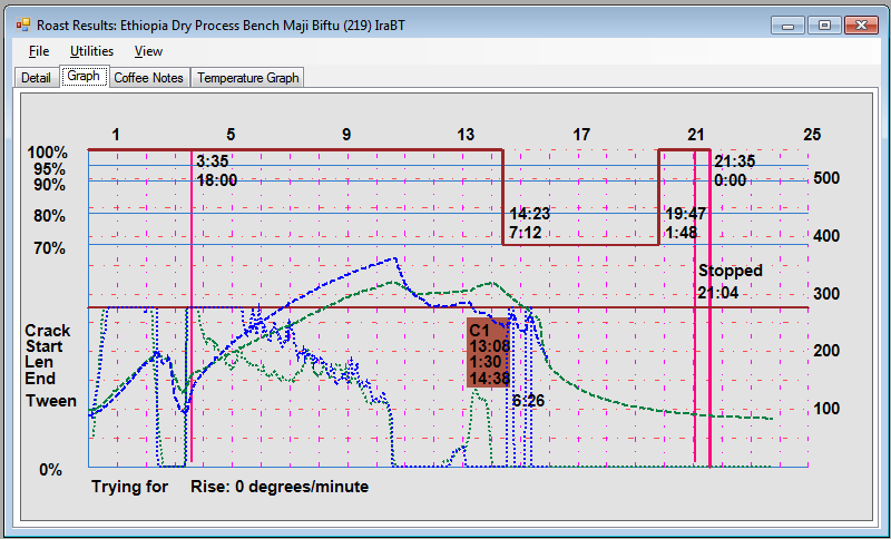 You can choose the Graph page to see a visual representation of how the roast progressed and where the cracks occurred and if there are coffee notes you can choose that page. Also, if you've logged temperatures, both the logged temperatures and the rate of rise for each temperature log will be displayed. The color and style for all of the elements of the graph are individually settable from Utilities=>Preferences.