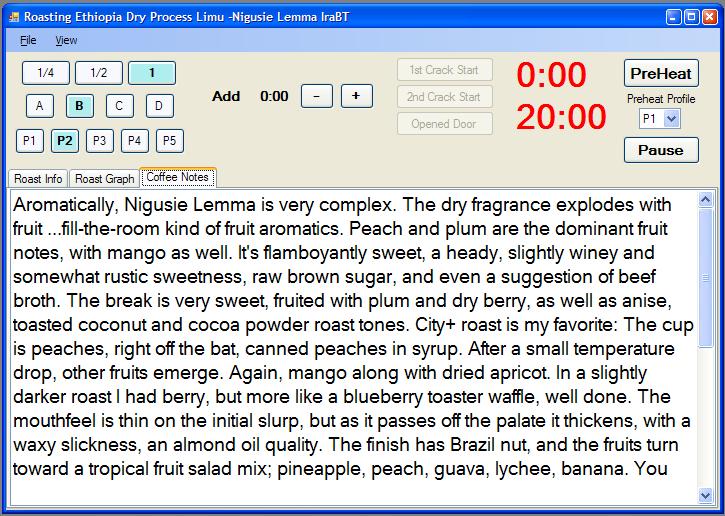 You might notice the Preheat button and pre-heat profile selector. You get 3 choices, NO, P1 and P3, those are the only 3 that make sense. For a 2 minute preheat, P1 and P2 are the same as are P3-P5. That's a feature I added so I can log the time I preheat the Behmor before starting the actual Roast timing. You may disable this feature on the Preferences page if you don't like it. I usually do a 2 minute preheat on P1 then press stop and input my actual choices. It makes sure I never run out of time and can't finish a roast. Most likely not approved by Behmor, but it seems to help me get better results. Your mileage may vary. Recently Behmor has started recommending a 1 minute P1 roast with the chaff tray and drum installed, then pressing Stop, pulling it all out, loading the drum and then starting the roast. I've always done 2 minutes P1 with the beans in, try both and see what works for you. If you follow the Behmor suggestion, be careful you don't touch anything hot.